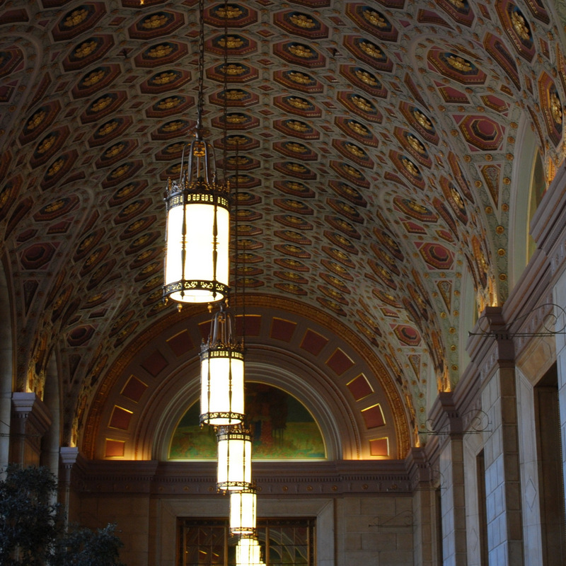 This neo-classical decor was found when developers removed the pink and red curtains that had been hanging there for decades. |